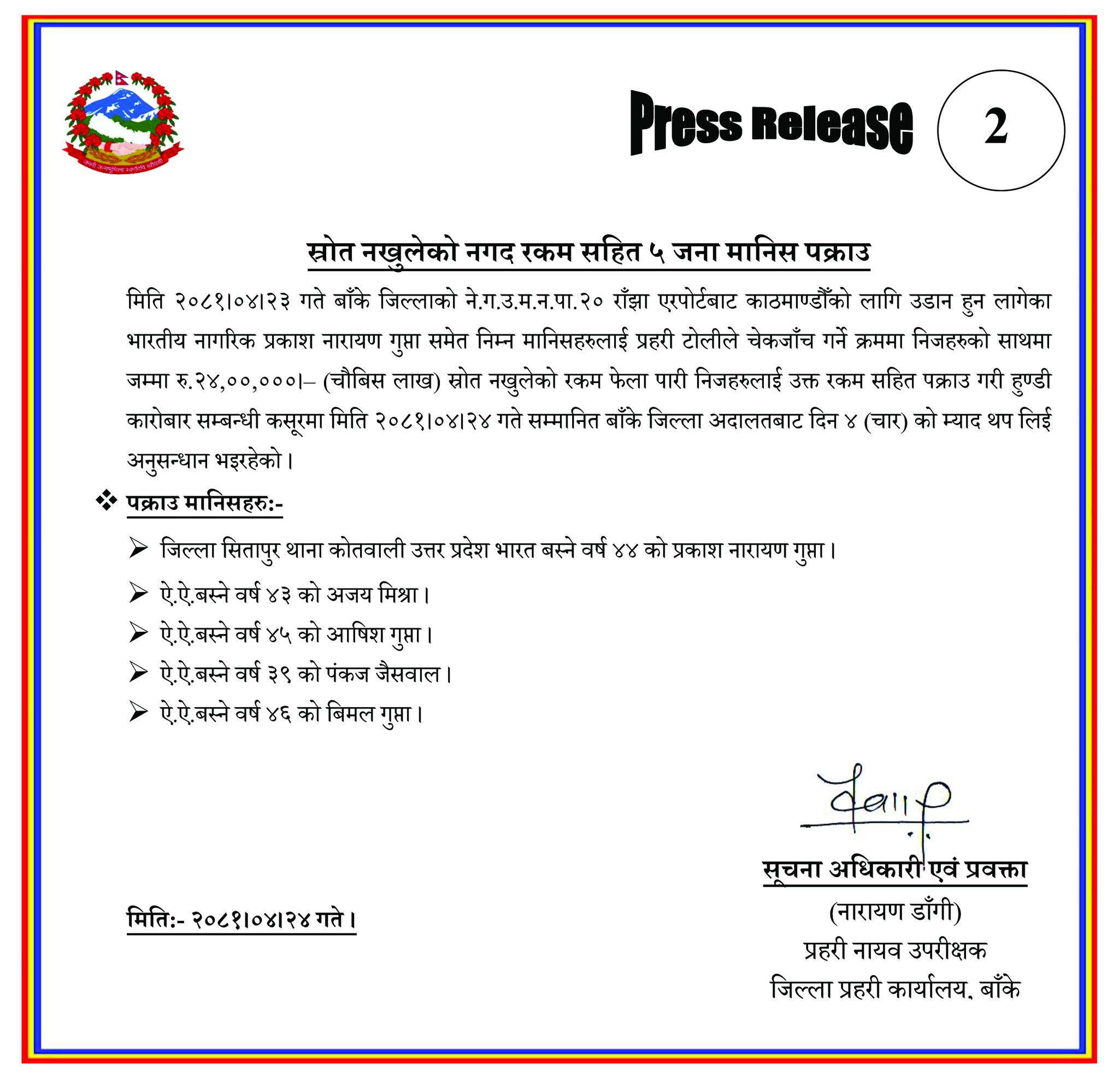 जिल्ला प्रहरी कार्यालय बाँकेका प्रहरी प्रवक्ता एवं प्रहरी नायब उपरीक्षक नारायण डाँगीका अनुसार भारतको उत्तर प्रदेशको सितापुर जिल्लाको थाना कोतवाली बस्ने ४४ वर्षीय प्रकाश नारायण गुप्ता, सोही ठाउँका ४३ वर्षीय अजय मिश्रा, ४५ वर्षीय आषिश गुप्ता, ३९ वर्षीय पंकज जैसवाल र ४६ वर्षीय बिमल गुप्ता रहेका छन् ।