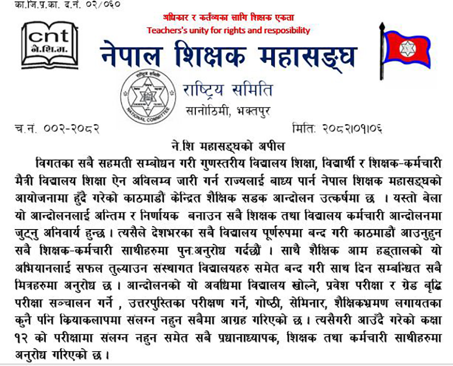 ‘शैक्षिक आम हड्तालको यो अभियानलाई सफल तुल्याउन संस्थागत विद्यालयहरु समेत बन्द गरी साथ दिन सम्बन्धित सबै मित्रहरुमा अनुरोध छ,’ महासंघले जारी गरेको विज्ञप्तिमा भनिएको छ । देशभरका सबै विद्यालय पूर्णरुपमा बन्द गरी काठमाडौं आउन सबै शिक्षक–कर्मचारीलाई महासंघले आग्रह गरेको छ ।