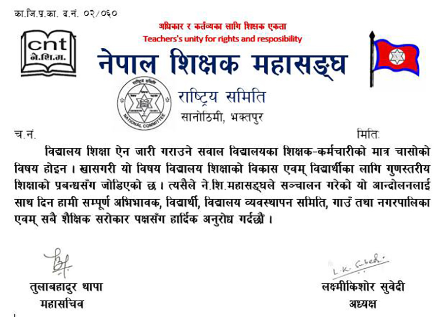 काठमडौं। शिक्षक महासंघले शैक्षिक हड्ताल भएकाले निजी विद्यालय पनि बन्द गर्न आग्रह गरेको छ । महासंघले विज्ञप्ति निकालेर निजी विद्यालय सञ्चालकहरूलाई विद्यालय बन्द गर्न आग्रह गरेको हो ।