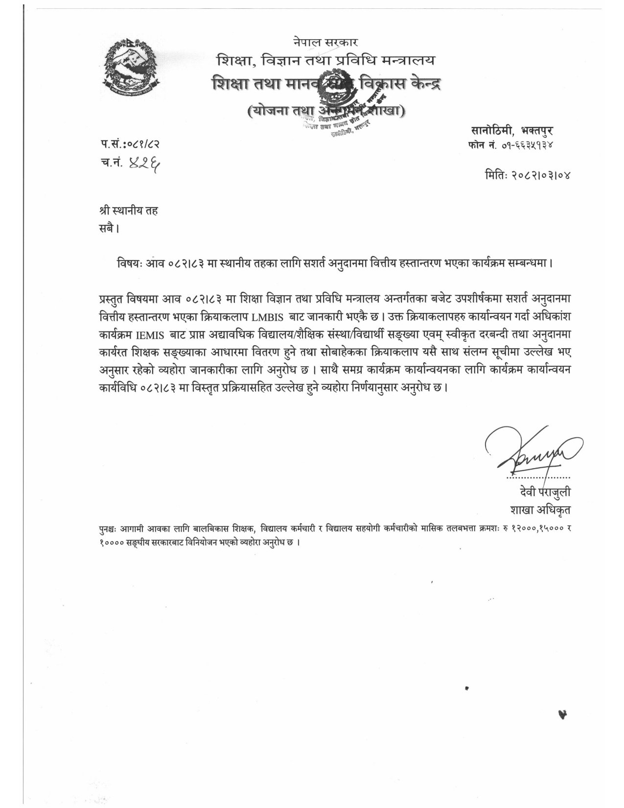आर्थिक वर्ष २०८२/०८३ को बजेट भाषणमा सरकारले सशर्त अनुदान वृद्धि गरेको छ । सोही अनुसार शिक्षा तथा मानव स्रोत विकास केन्द्रले सबै स्थानीय तहलाई परिपत्र गर्दै सङ्घीय सरकारबाट उपलब्ध गराउने पारिश्रमिक वृद्धि हुने भएको हो ।