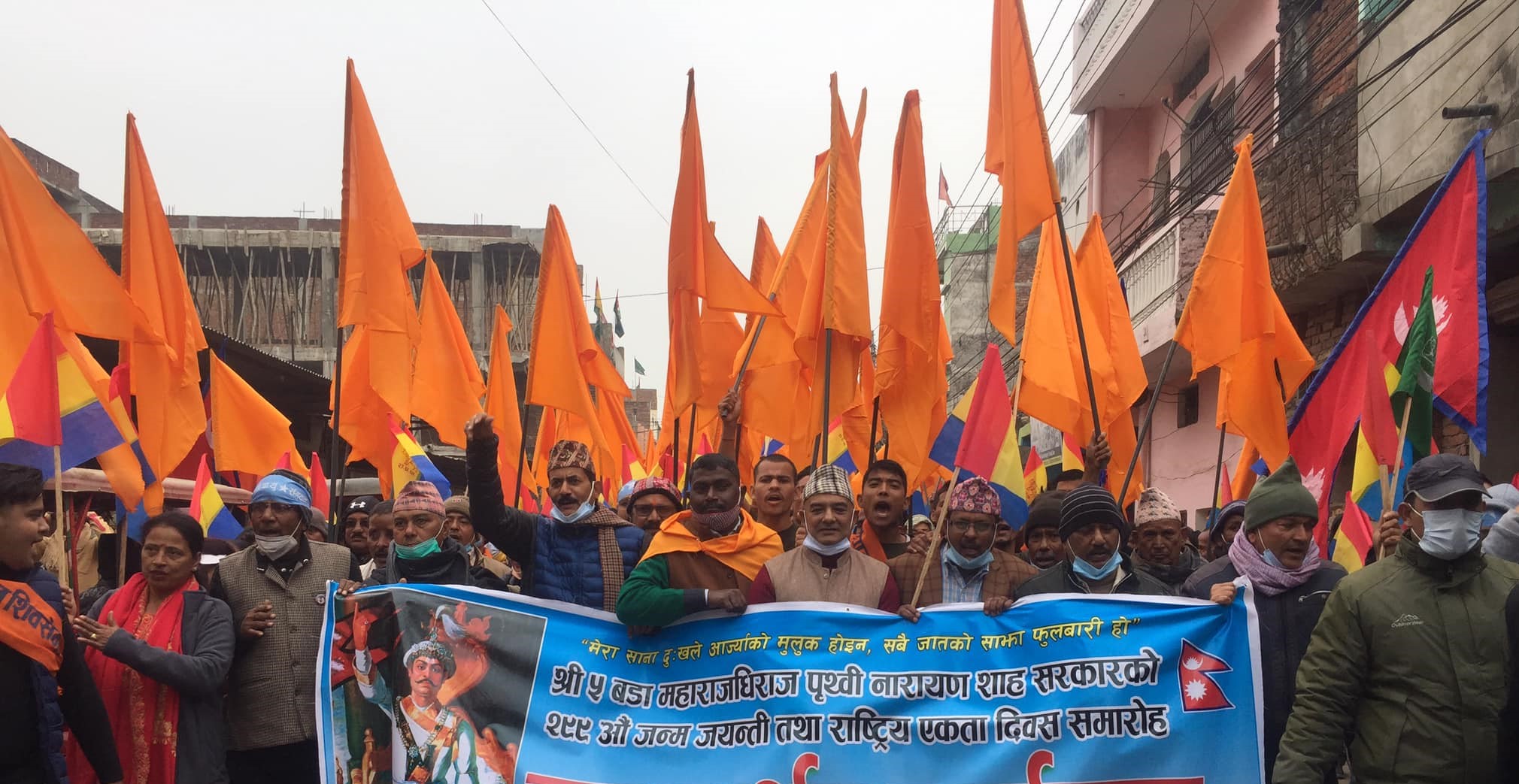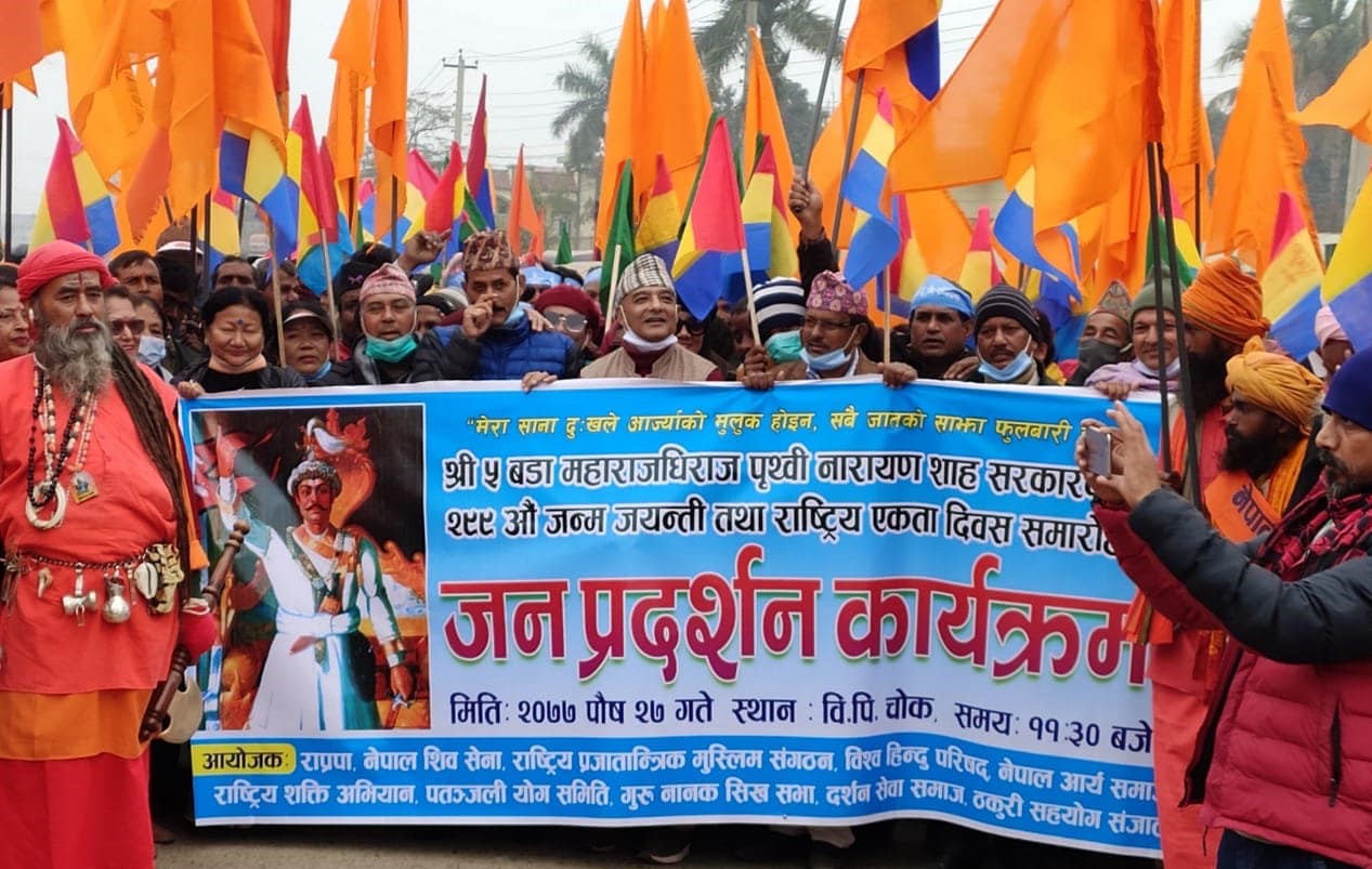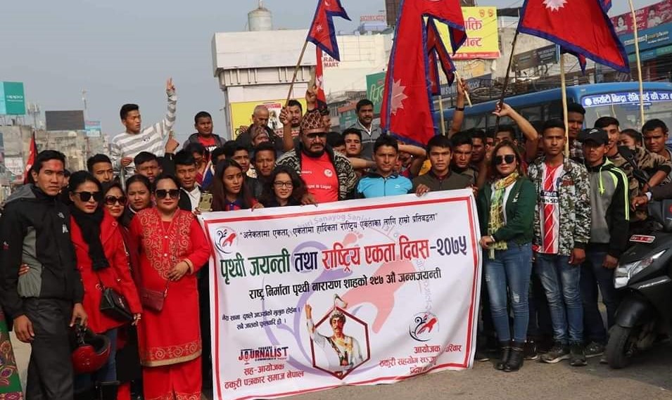 सरकारले पृथ्वी जयन्ती र राष्ट्रिय एकता दिवस मनाउन छाडे पनि नागरिकस्तरबाट भने विभिन्न कार्यक्रम भने हरेक वर्ष हुने गरेका छन् । यस अवसरमा नेपालगञ्जमा र्याली, दिप तथा माल्यापर्ण कार्यक्रम गरिएको छ । तस्बिर : अरुण शर्मा