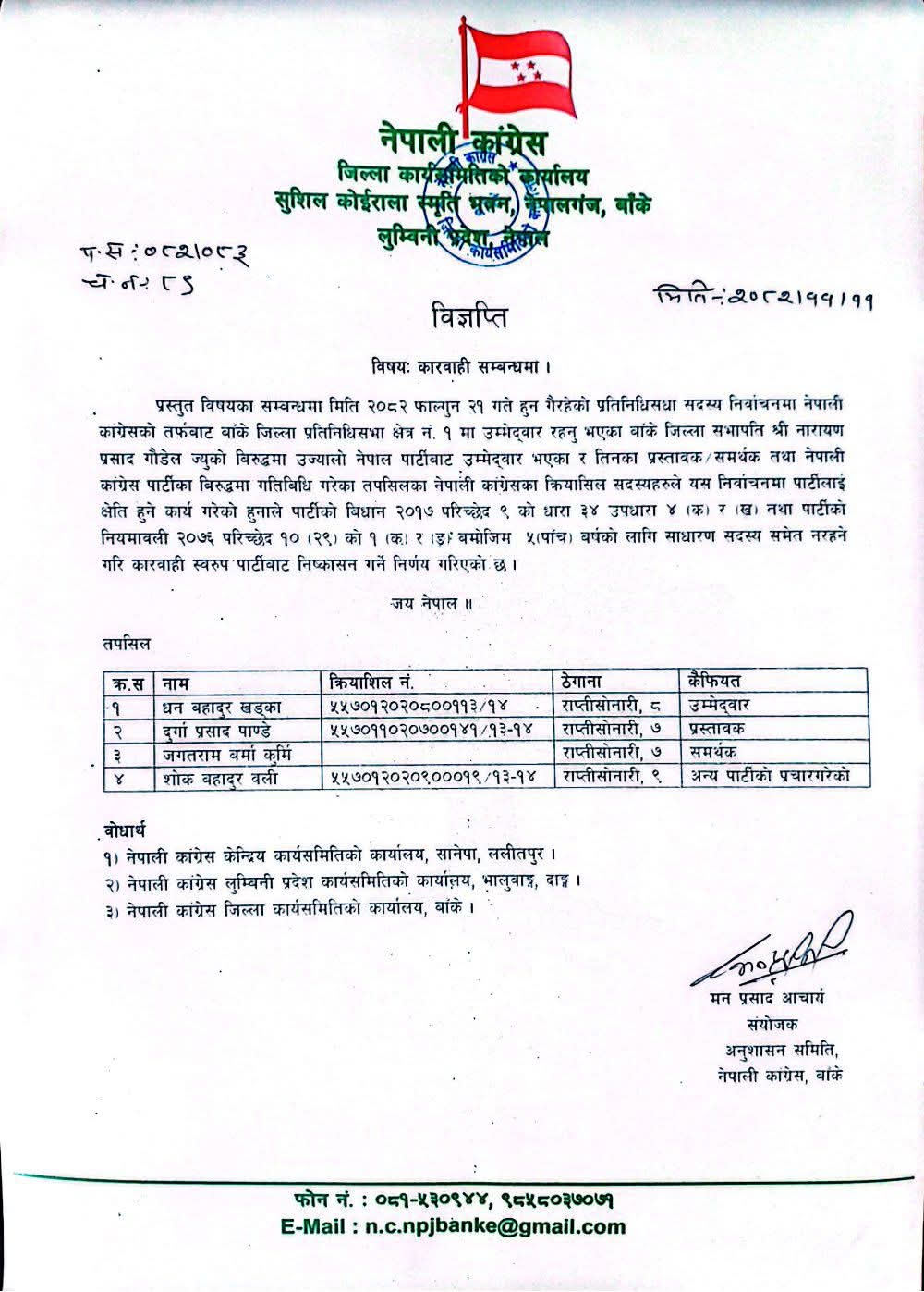 काँग्रेस बाँकेका अनुशासन समितिका संयोजक मन प्रसाद आचार्यका अनुसार बाँकेको राप्ती सोनारी गाउँपालिका वडा नम्बर ७ का दुर्गा प्रसाद पाण्डे र जगतराम बर्मा कुर्मी, वडा नम्बर ८ का धन बहादुर खड्का र वडा नम्बर ९ का शोक बहादुर वलीलाई कारबाही गरिको हो ।