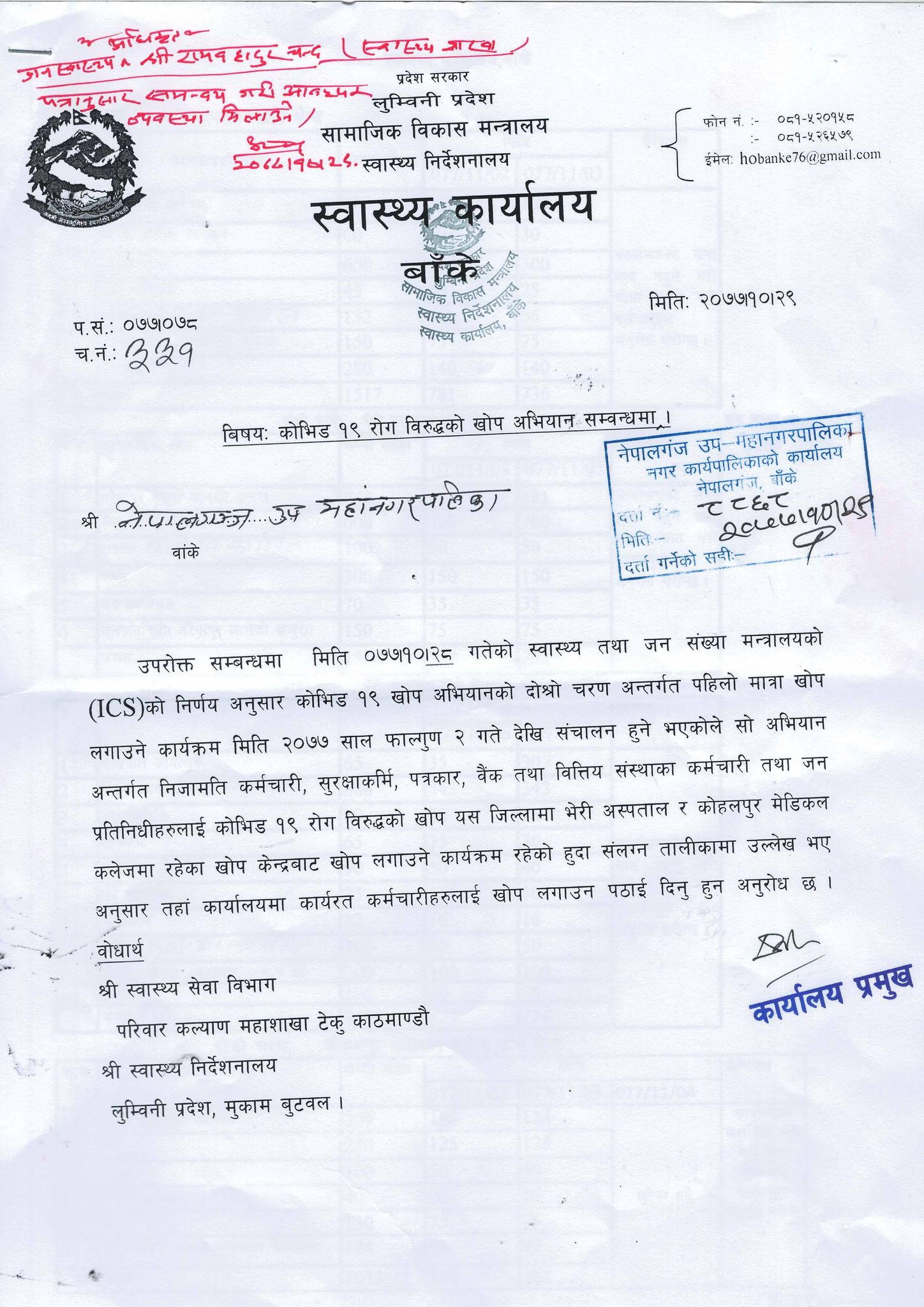 फागुन २ गते १ सय ४० र ३ गते १ सय ४० जना पत्रकारलाई खोप लगाइने जिल्ला कोभिड-१९ संकट व्यवस्थापन केन्द्र बाँकेका फोकल पर्सन तेज वलीले जानकारी दिनुभयो । जिल्लामा दोस्रो चरणमा जम्मा ५ हजार ५ सय ८६ जनालाई खोप लगाइनेछ ।