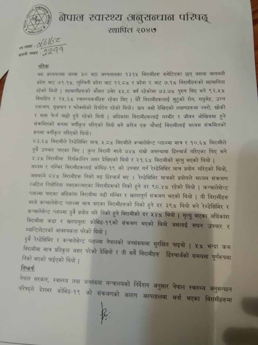 देशभरका ३० वटा अस्पतालका १ हजार ३१५ जना बिरामीलाई समेटेर परिषद्ले अवलोकन अध्ययन गरेको थियो । अध्ययनको क्रममा गम्भीर संक्रमण देखिएका बिरामीहरुलाई समावेश गरिएको र औसत उमेर ५५ वर्ष रहेको परिषद्ले जनाएको छ ।