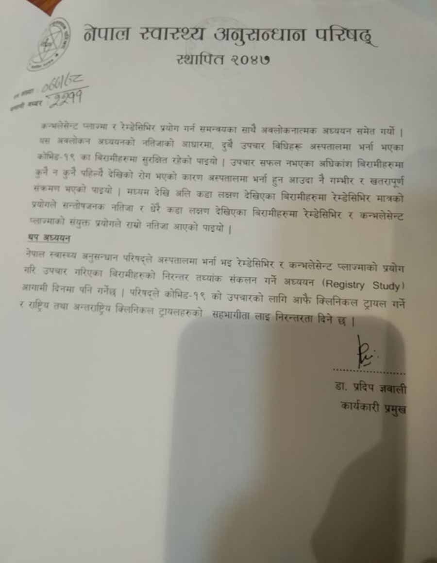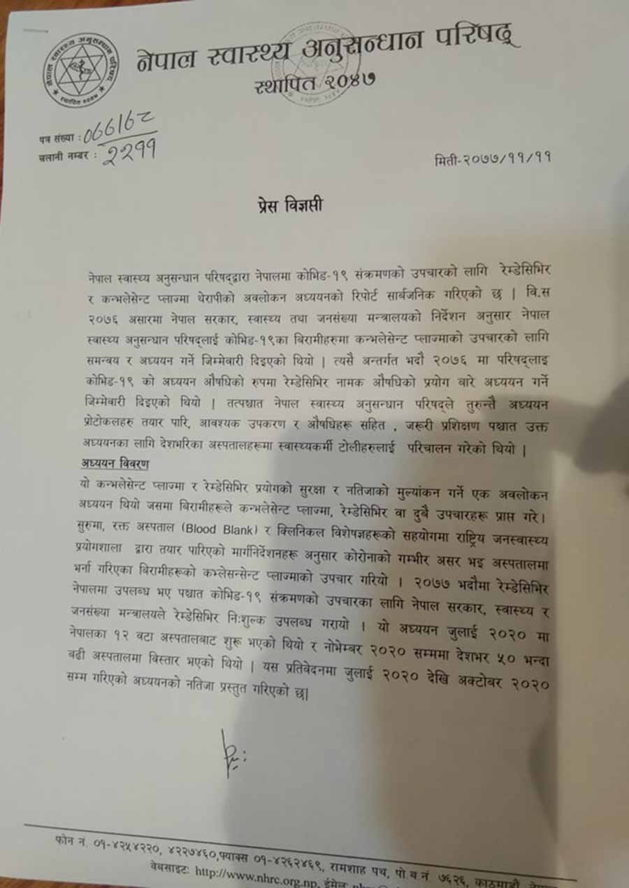 स्वास्थ्य तथा जनसंख्या मन्त्रालयले कोभिड १९ का बिरामीहरुको उपचारमा कन्भलेसेन्ट प्लाज्मा थेरापी विधि र रेम्डेसिभिर नामक औषधिको प्रयोगको प्रभावकारिताबारे अध्ययन गर्ने जिम्मेवारी परिषद्लाई दिएको थियो । परिषद्ले मंगलबार सार्वजनिक गरेको आफ्नो प्रतिवेदनमा मध्यम संक्रमण भएकाहरुलाई रेम्डेसिभिरबाट उपचार गर्दा ९८ प्रतिशतभन्दा बढी निको भएको उल्लेख छ ।