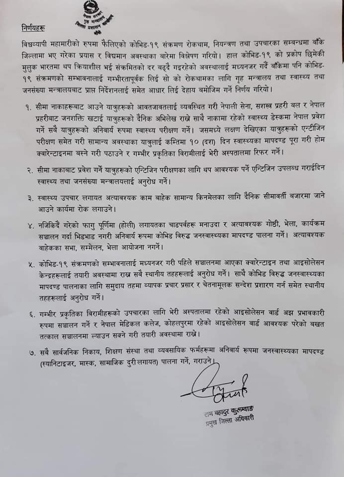 केन्द्रको बैठकले केन्द्रीय परिपत्र अनुसार नाकामा कडाई गर्ने, आम नागरिकलाई भिडभाड नगर्न, स्वास्थ्य सुरक्षाका मापदण्ड पालना गर्न र सुरक्षित रहन आग्रह गरेको छ ।