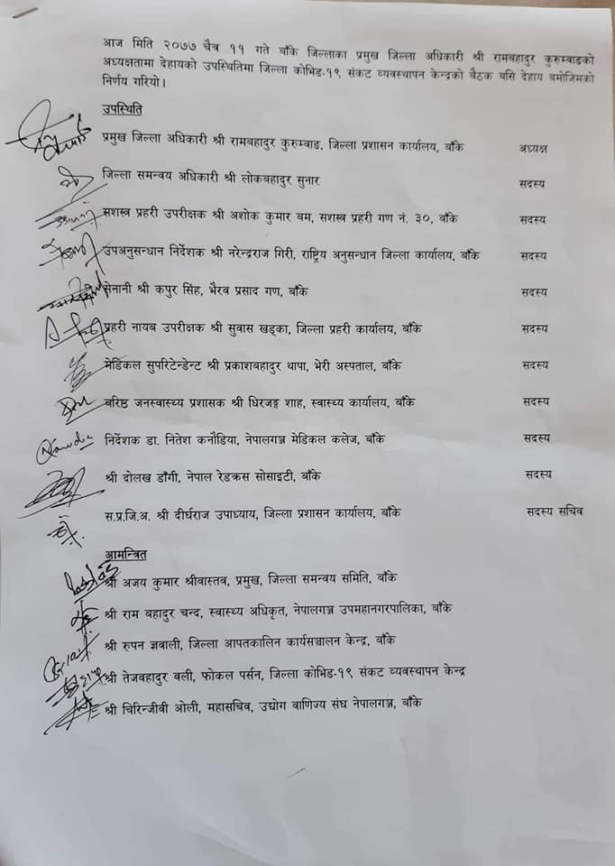 बैठकले जमुनाहास्थित सुरक्षा निकायलाई सुरक्षा व्यवस्था कडा गर्न तथा नेपालगञ्ज उपमहानगरपालिका र स्वास्थ्य कार्यालयको समन्वयमा स्वास्थ्य परिक्षणको काम नियमित संचालन गर्न जोड दिएको छ