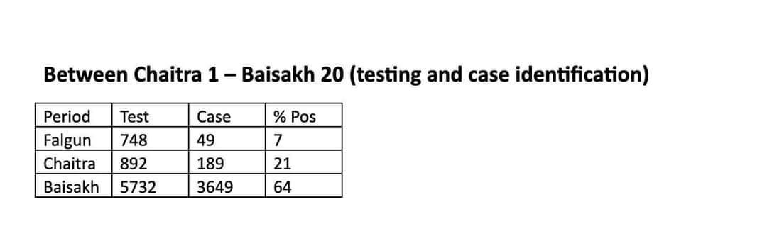 नयाँ संक्रमित पहिचानको प्रत्येक ७ दिनको औसत उच्च बिन्दु फागुनमा केवल ६.८ % थियो भने चैतमा महिनाको अन्तिम दिन ३४% रहेको थियो । जब कि बैशाख १ देखि त्यो उच्च बिन्दु अस्वाभाविक बढेको देखिन्छ । बैशाख १० मा ८०% मा पुगेको उक्त दर हाल ७१% मा रहेको छ ।