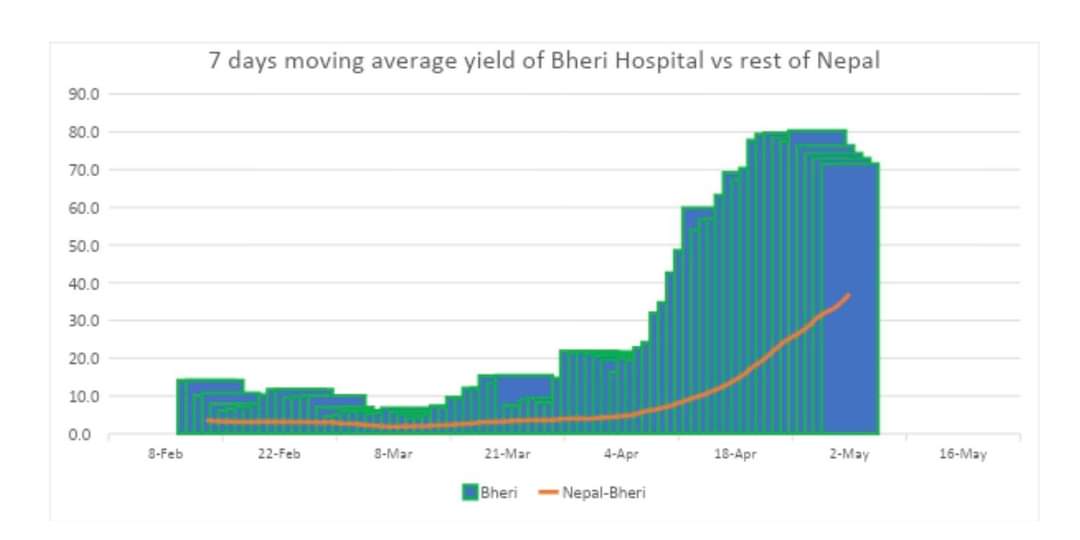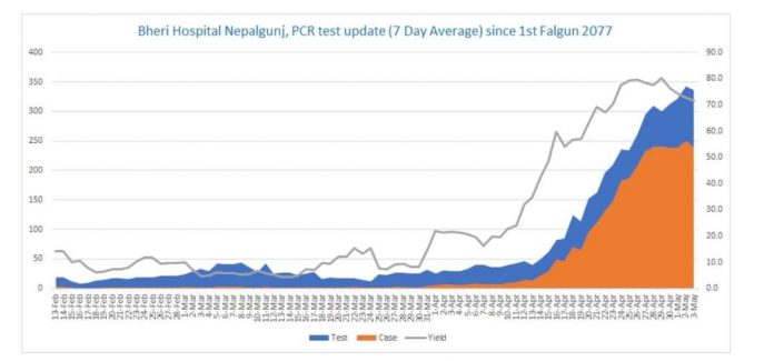 चैत १ देखि बैशाख २० सम्म भेरी अस्पतालबाट नयाँ संक्रमित पहिचान भएको संख्या ३७९० रहेको छ । जबकि बैशाख १२ देखि २० मा मात्र १८४७ पहिचान भएका छन् । यसरी संक्रणको doubling time पछिल्लो दिनमा आएर ८ दिन मात्र रहेको छ । यसले संक्रमण कति तीब्र गतिमा फैलिरहेको छ भन्ने देखाउँछ ।