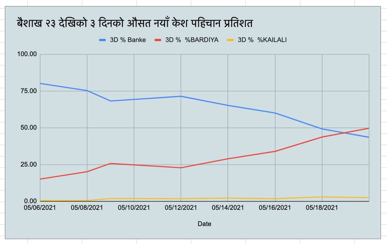 बैशाख २३ अर्थात मे ६ देखि बिहीबारसम्मको दैनिक पुष्टि हुने संक्रमितको जिल्लाका भारको ३ दिनको औसत को बिश्लेषण गर्दा बाँकेको प्रतिशत ८० प्रतिशतबाट ४३ प्रतिशतमा घटेको छ ।