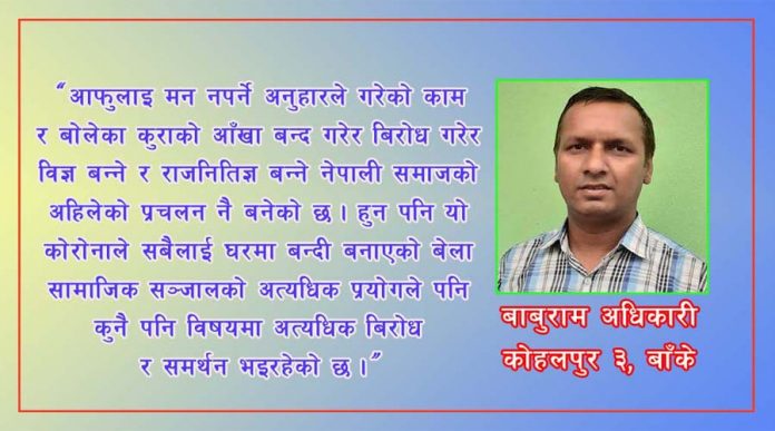 तर आफुलाइ मन नपर्ने अनुहारले गरेको काम र बोलेका कुराको आँखा बन्द गरेर बिरोध गरेर विज्ञ बन्ने र राजनितिज्ञ बन्ने नेपाली समाजको अहिलेको प्रचलन नै बनेको छ । हुन पनि यो कोरोनाले सबैलाई घरमा बन्दी बनाएको बेला सामाजिक सञ्जालको अत्यधिक प्रयोगले पनि कुनै पनि विषयमा अत्यधिक बिरोध र समर्थन भइरहेको छ ।