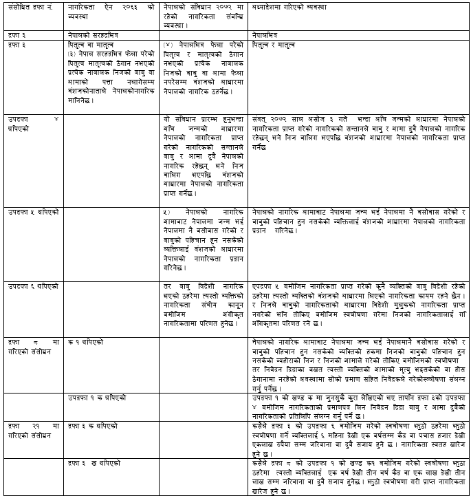 हिजो मात्र सरकारको सिफारिसमा सम्माननिय राष्ट्रपतिबाट जारी गरिएको नागरिकता ऐन संसोधन सम्बन्धि अध्यादेशको नेपालको संविधान २०७२, नागरिकता ऐन २०६३ संग तुलनात्मक अध्ययन गर्दा नेपालको संविधान २०७२ मा गरिएको नागरिकता सम्बन्धि व्यवस्थालाई जस्ताको तस्तै कार्यन्वयन गर्न गरिएको हो भन्नलाई कुनै धक मान्नु पर्ने अवस्था छैन । नयाँ संविधान जारि भएपछि संविधान कार्यन्वयन गर्नका लागी नयाँ कानुन निर्माण तथा मौजुदा कानुनको परिमार्जन गर्ने प्रक्रिया सामान्य हो ।