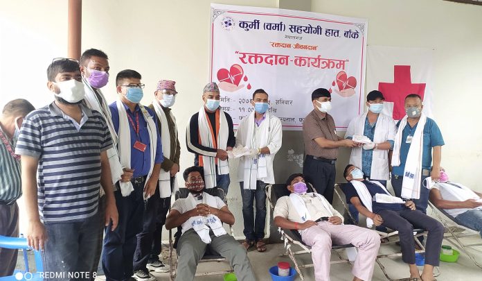 नेपालगञ्ज । कुर्मी (बर्मा) सहयोगी हातले शनिबार नेपालगञ्जमा बृहत रक्तदान कार्यक्रम गरेको छ । नेपालगञ्जस्थित फत्तेबाल आँखा अस्पतालमा आयोजना रक्तदान कार्यक्रममा ४५ जनाले रक्तदान गरेका छन् ।