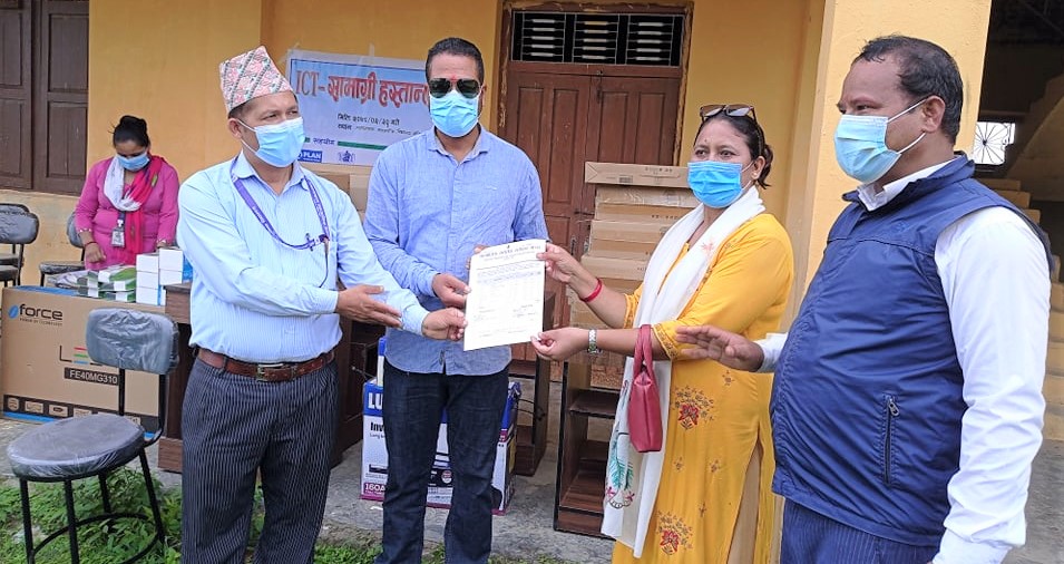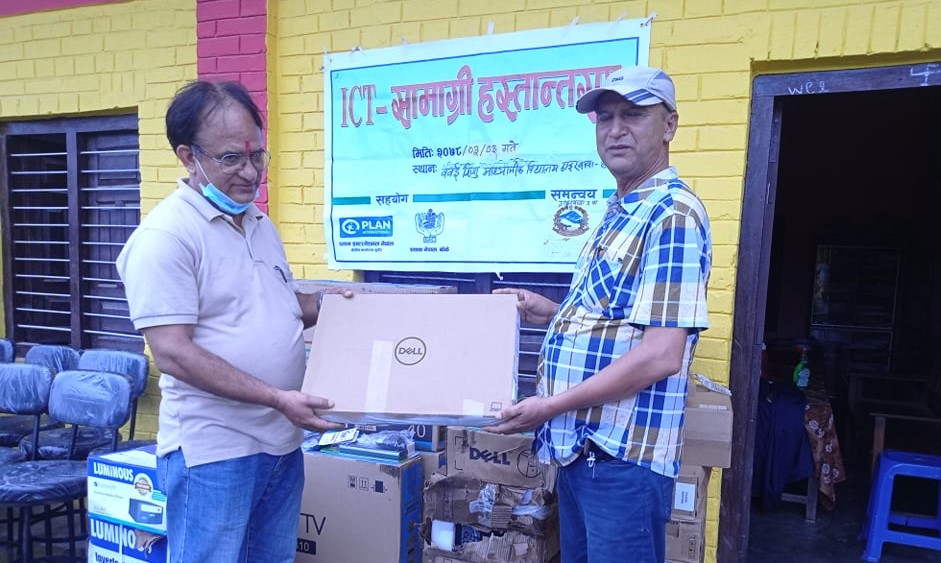 ७ वटा बिधालयमा आइसीटी ल्यापका लागी प्रति बिधालय ४६ सेट डेसटप कम्युटर, ७ थान लेपटप, ७ थान प्रोजेक्टर, ५ थान कम्युटर टेवल, ३५ थान कम्युटर कुर्चि, २१ थान एलीडी टिभि, ब्यट्टी र इन्भटर ७ सेट, पेन डाइप १५ थान मल्टी पलग ३५ सेट गरि कुल ४० लाख वराबरको आइसिटि सामाग्री हस्तान्तरण गरिने योजना रहेको परियोजना अधिकृत लक्ष्मी प्रसाद शर्माले जानकारी दिनुभयो ।