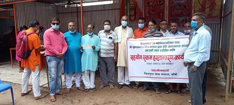 नेपालगञ्ज । चित्र गुप्त सेवा समाज बाँकेले भेरी अस्पतालमा संचालित अञ्ज्नी माता रसोइलाई सहयोग स्वरुप एघारा हजार रकम हस्तान्तरण गरेको छ।