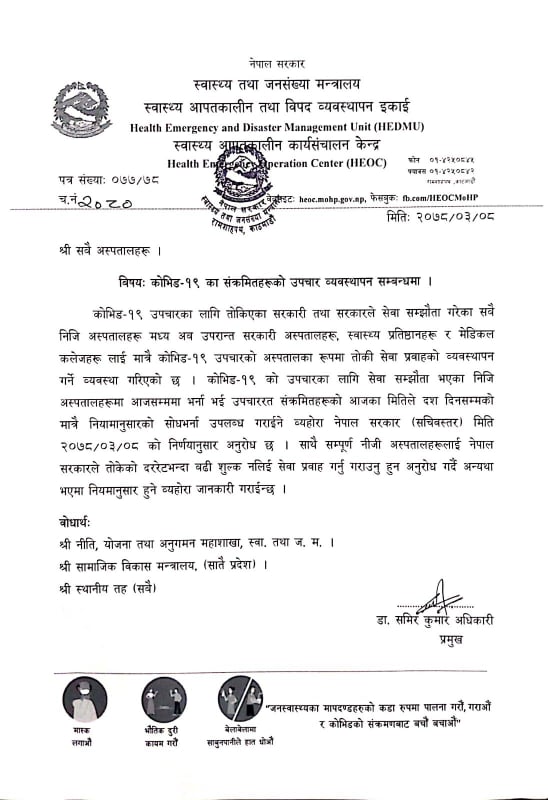 काठमाडौँ– सरकारले कोभिड-१९ उपचारका लागि सरकारी अस्पतालहरू, स्वास्थ्य प्रतिष्ठानहरु र मेडिकललाई मात्र तोकेको छ । असार गते ६ गते सचिवस्तरीय तहबाट यस्तो निर्णय भएको हो ।