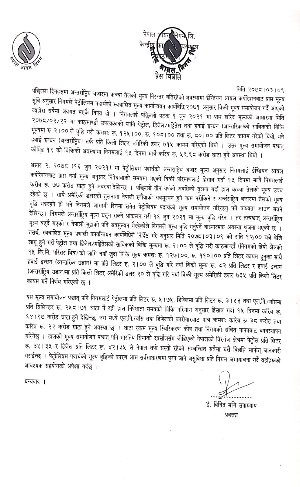 निगमले डलरसँग नेपाली मुद्राको अववमूल्यनका कारण भविष्यमा अझै मूल्य बढ्न सक्ने बताएको छ ।