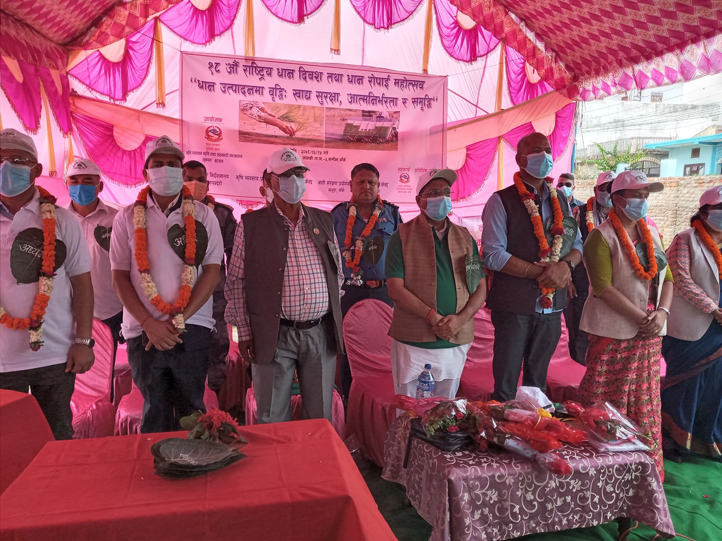 भूमि व्यवस्था तथा सहकारी लुम्बिनी प्रदेश मन्त्री विजय बहादुर यादवले जानकी गाउँपालिका वार्ड नं.–३ करमोहनाका सन्त कुमार वर्माको निजी २ विगहा पक्की जग्गामा धान रोप्ने मेशीन चलाएर धान रोपाईको उद्घाटन गर्नु भएको थियो । उद्घाटन गर्दै मन्त्री यादवले १८ वर्षदेखि धान दिवस मनाउँदै आएको र कृषकमा जागरुकता आओस् भनेर प्रदेशभरिमा पर्वको रुपमा धान दिवस मनाइरहेको बताउनुभयो ।