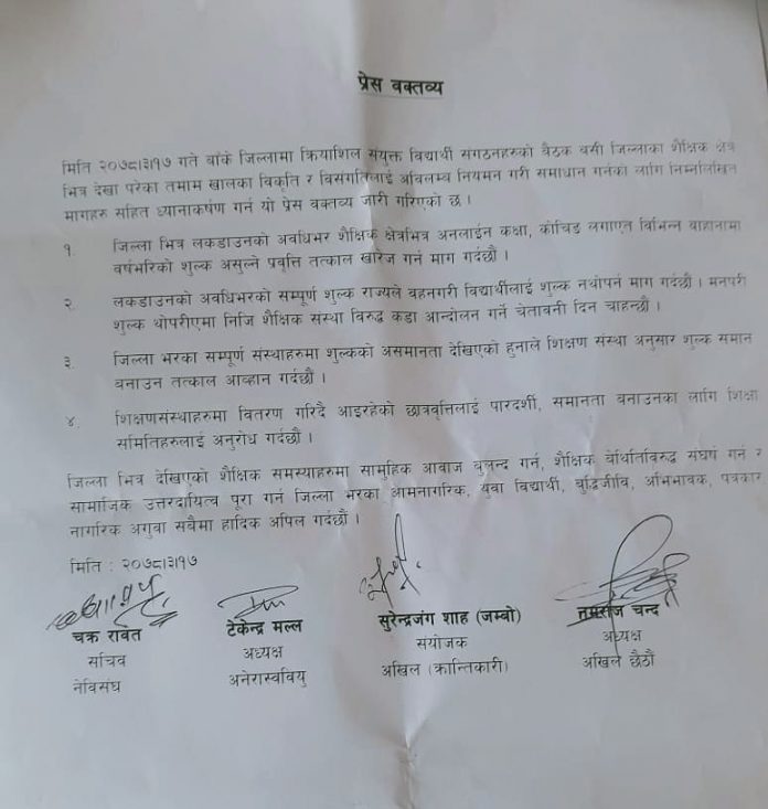 नेबिसंघका सचिव चक्र रावत, अनेरास्वबियुका अध्यक्ष टेकेन्द्र मल्ल, अखिल क्रान्तिकारीका संयोजक सुरेन्द्र जंग शाह –जम्बो) र अखिल छैटोका नमराज चन्दद्धारा जारी भएको बिज्ञप्तिमा लकडाउनका अवधिमा पढाई नै नगराई अनलाईन कक्षा कोचिगं लगायत बिभिन्न बहानामा शुल्क असुल गरिएकाले तत्काल यो समस्या समाधानका लागि सम्बन्धित निकायले चासो देखाउनुपर्ने माग गरेका छन् ।