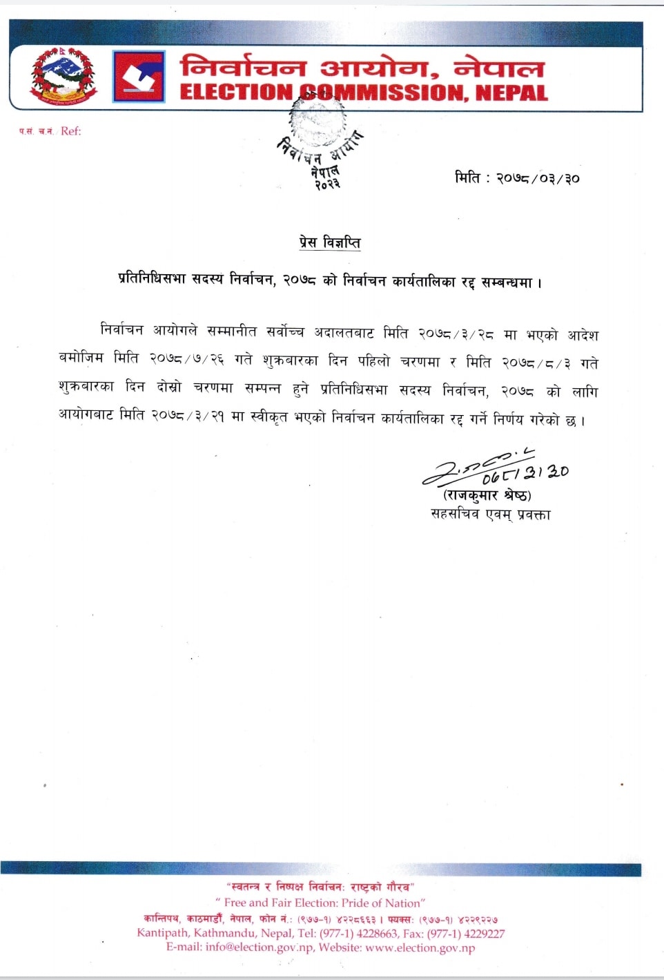 आयोगले मिति २०७८ असार २१ गते स्वीकृत भएको निर्वाचन कार्यतालिका रद्द गर्ने निर्णय गरेको अयोगका सहसचिव एवं प्रवक्ता राजकुमार श्रेष्ठद्धारा जारी सूचनामा जनाइएको हो ।