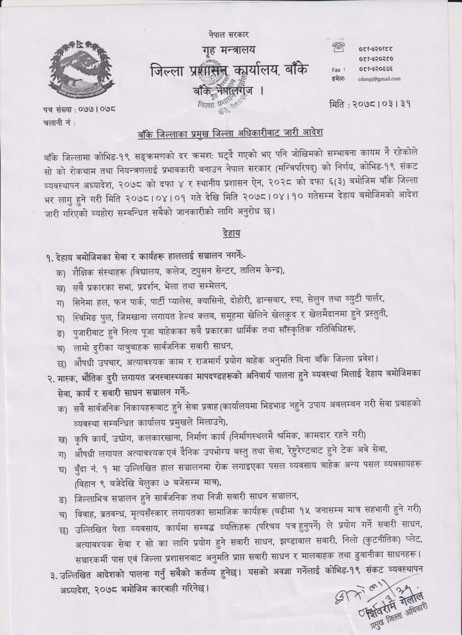 नेपालगञ्ज । बाँकेमा प्रशासनले फेरि निषेधाज्ञालाई बढाइएको छ । जिल्ला प्रशासन कार्यालय बाँकेले बिहीबार एक सूचना जारी गर्दै जारी निषेधाज्ञालाई थप गरिएको हो ।