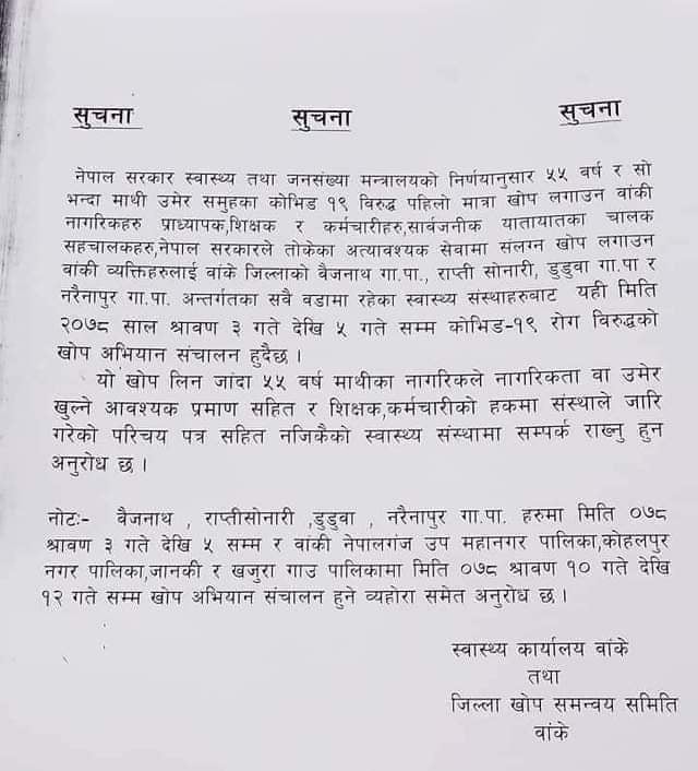 कार्यालयले एक सूचना जारी गर्दै नेपालगन्ज उपमहानगरपालिका, कोहलपुर नगरपालिका, जानकी गाउँपालिका र खजुरा गाउँपालिकामा भने श्रावण १० गतेदेखि १२ गतेसम्म खोपको पहिलो मात्रा दिईने जनाएको छ । यो अभियानमा ५५ वर्ष र सो माथिका उमेर समूहलाई खोप लगाईने छ ।
