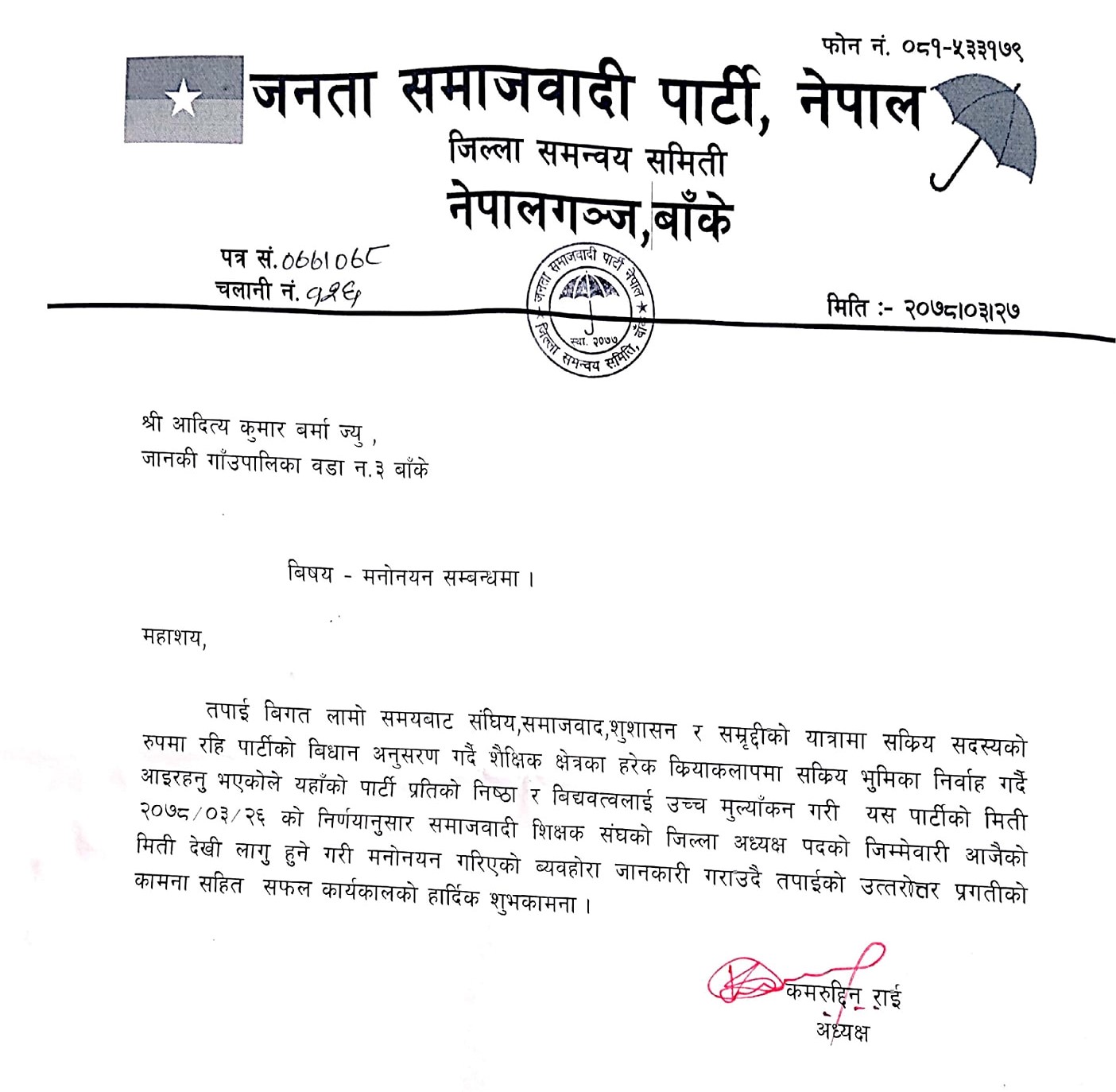 संघीय, समाजवाद, शुशासन र समृद्धिको यात्रामा सक्रिय सदस्यको रुपमा रही पार्टीको बिधान अनुसरण गर्दै शैक्षिक क्षेत्रको हरेक क्रियाकलापमा सक्रिय भूमिका निर्वाह गर्दै आइरहेको कुरालाई उच्च मुल्याँकन गर्दै समाजवादी शिक्षक संघको जिल्ला अध्यक्षको जिम्मेवारीमा मनोनयन गरिएको अध्यक्ष राईद्धारा जारी प्रेस बिज्ञप्तिमा उल्लेख छ ।