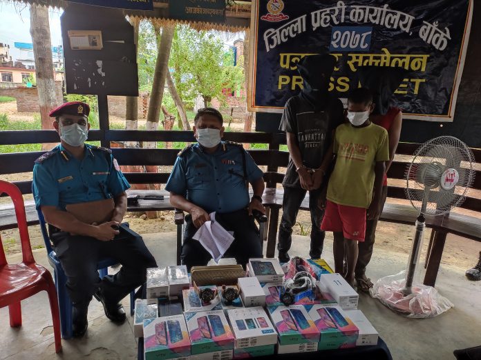 मिति २०७८।०४।०८ गते बिहान ०२:०० बजेको समयमा जिल्ला बाँके नेपालगंज उप-महानगरपालिका वडा नं।४ बसपार्क रोडमा रहेकोपुर्ण प्रसाद गौतमले संचालन गरेको गौतम ईलेक्ट्रोनिक्स एण्ड मोवाईल सप्लायर्सको सटर फोडी पसल भित्र प्रबेश गरी पसलमा रहेका बिभिन्न कम्पनीका मोवाईल,घडी, एम.पि.घ,विभिन्न वैंकहरुको चेक लगायतका अं. मुल्य रु १० लाख बराबरको सामानहरूचोरी भएको घटना सम्बन्धमा यस कार्यालय बाट बिशेष प्रहरी टोली परिचालन गरी अनुसन्धान गर्ने क्रममा उक्त ईलेक्ट्रोनिक्स एण्ड मोवाईल सप्लायर्समा चोरी गर्ने कार्यमा संलग्न बाँके नेपालगंज उप-महानगरपालिका वडा नं.९ बस्ने बर्ष २४ को सुमित शर्मा, ऐ.ऐ.वडा नं.१३ बस्ने बर्ष १८ को नानु खटिक र १२ वर्षिया एक वालक सहित ३ जनालाई चोरीको बिभिन्न कम्पनीको मोवाईल थान ३६ , जि शोक कम्पनीको घडी थान ६ र एम पि थ्रि थान १ सहित मिति २०७८।०४।१३ गते साँझ अं.१०: ०० बजेको समयमा नियन्त्रणमा लिई अनुसन्धान भईरहेको छ ।