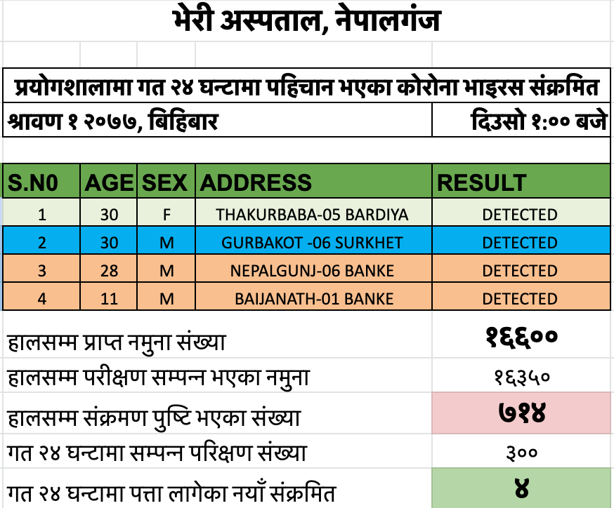 यस्तै बर्दिया ठाकुरबाबा नगरपालिका वडा न–५ की ३० वर्षीया महिला र सुर्खेत, गुर्भाकोट ६ का एक ३० वर्षीय पुरुषमा कोरोना देखिएको हो ।