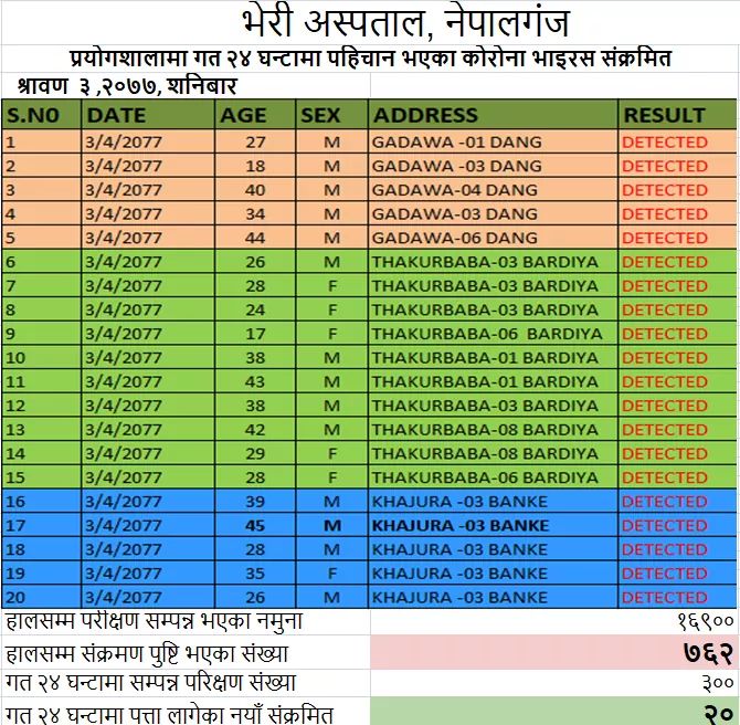 अस्पतालले जारी गरेको सूचना अनुसार शनिबार बाँकेकाे खजुरा गाउँपालिका वडा न-३ का २६, २८, ३५, ३९ र ४५ वर्षीय व्यक्तिहरूमा संक्रमण देखिएकाे छ । संक्रमण देखिएकाे ३५ वर्षीया महिला पनि छन् ।