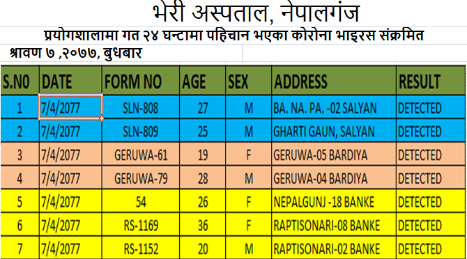 पछिल्लो २४ घण्टायता भेरी अस्पताल नेपालगञ्जमा भएको परीक्षणमा बाँकेका तीन जनासहित सात जनामा कोरोना पुष्टि भएको हो ।