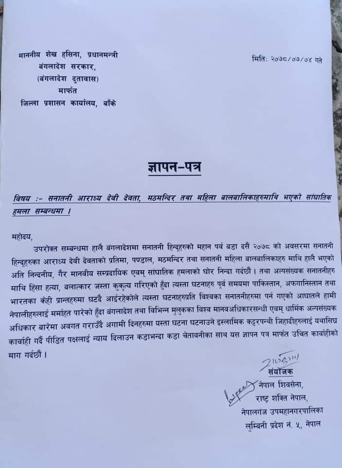 नेपालगन्जमा प्रदर्शनसंंगै प्रशासनमार्फत बंगलादेश सरकारलाई ध्यानाकर्षण पत्र पठाईएकाे छ ।
