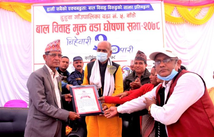 डुडुवा । बाँकेको डुडुवा गाउँपालिका वडा नम्बर ५ लाई मंगलबार एक कार्यक्रमका वीच बालविवाह मुक्त वडा घोषणा गरिएको छ । डुडुवा गाउँपालिकाको वडा नम्बर ५ पालिकाकै पहिलो बालविवाह मुक्त वडा घोषणा भएको हो ।
