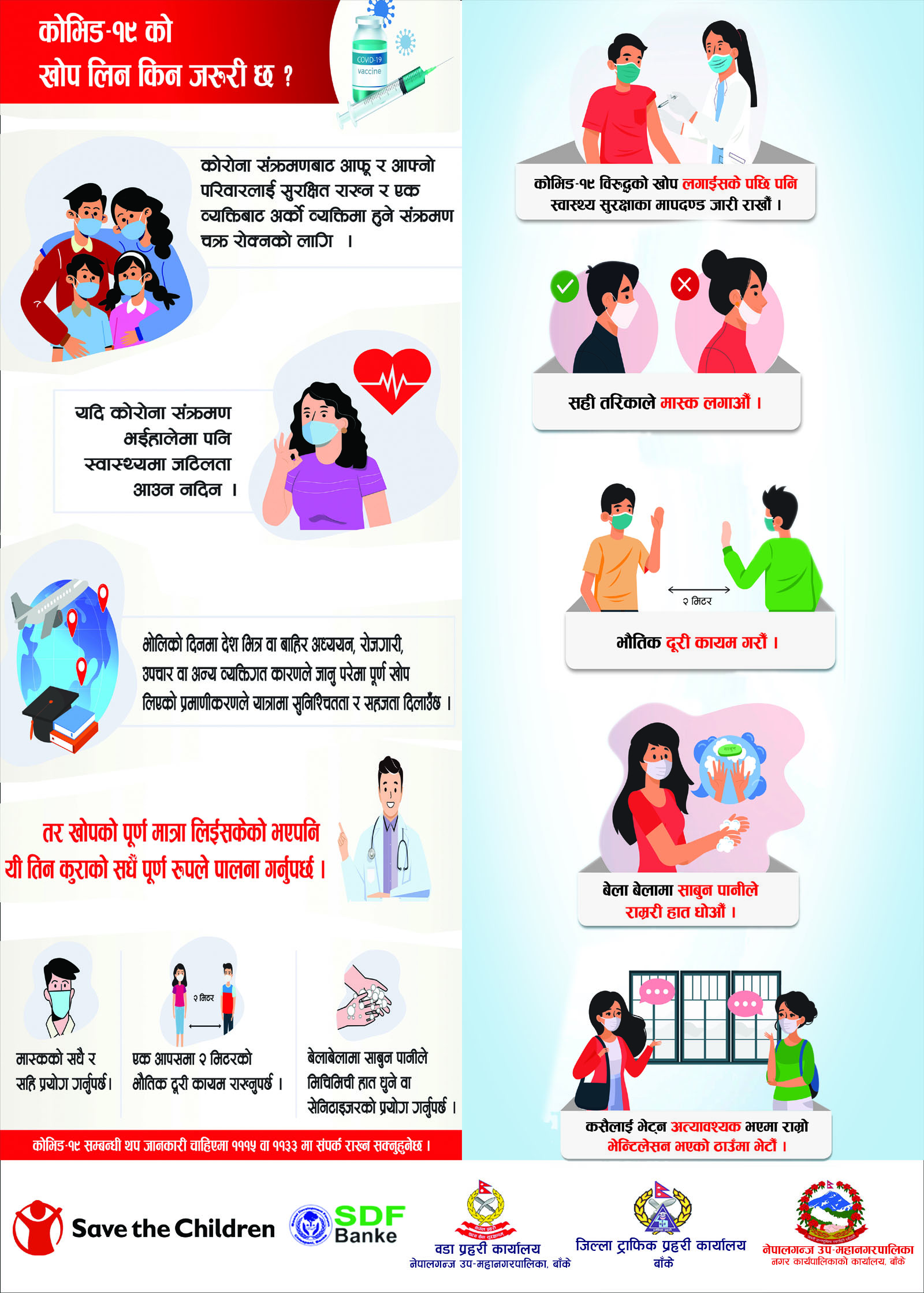 नेपालगञ्ज उपमहानगरपालिकाको समन्वयमा सेभ द चिल्ड्रेनको सहयोगमा सामाजिक बिकास मंच (एस डि एफ) बाँकेले खोप बारेको अभिमुखिकरण शुरु गरेको छ । अभिखिकरणका क्रममा नेपालगञ्जका थुप्रै व्यक्तिहरु अझै पनि कोरोना बिरुद्धको खोपबाट बन्चित रहेको पाइएको छ ।