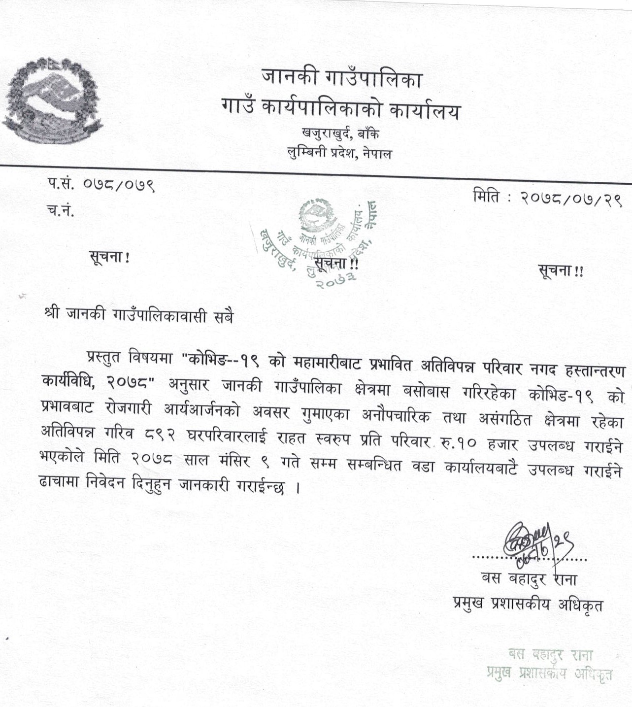 गाउँपालिकाका प्रमुख प्रशासकीय अधिकृत बस बहादुर रानाद्धारा जारी सूचनामा कोभिड १९ को महामारबिाट प्रभावित अतिबिभिन्न परिवारलाई नगद हस्तान्तरण कार्यबिधि २०७८ अनुसार उक्त रकम राहत स्वरुप बितरण गर्न लागिएको लेखिएको छ ।