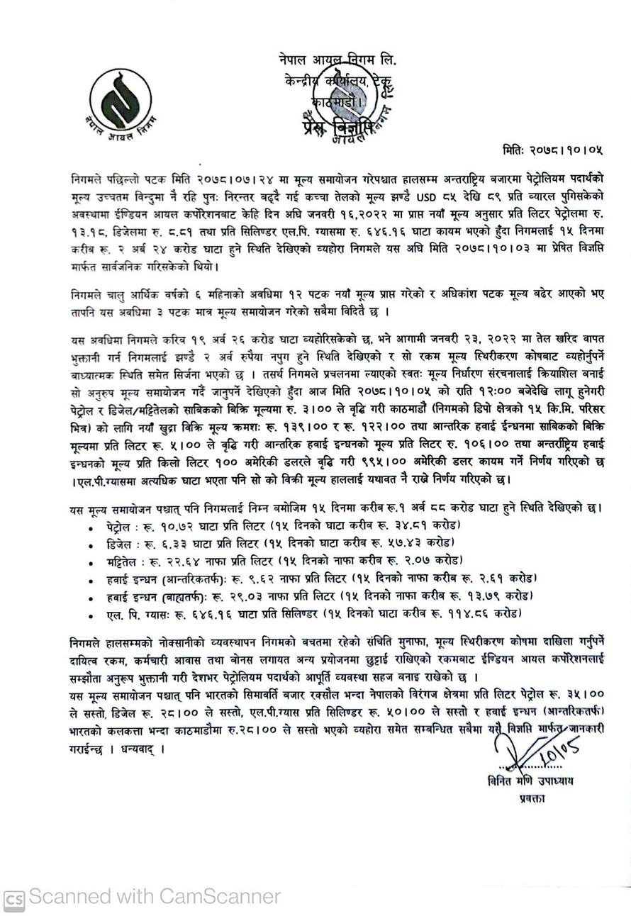 अन्तर्राष्ट्रिय तर्फको हवाई इन्धनको मूल्य प्रतिकिलोलिटर १०० अमेरिकी डलरले वृद्धि गरी ९९५ अमेरिकी डलर कायम गर्ने निर्णय गरिएको निगमले जनाएको छ । पछिल्लो पटक मिति २०७८ कात्तिक २४ गते मूल्य समायोजन भएको थियो ।